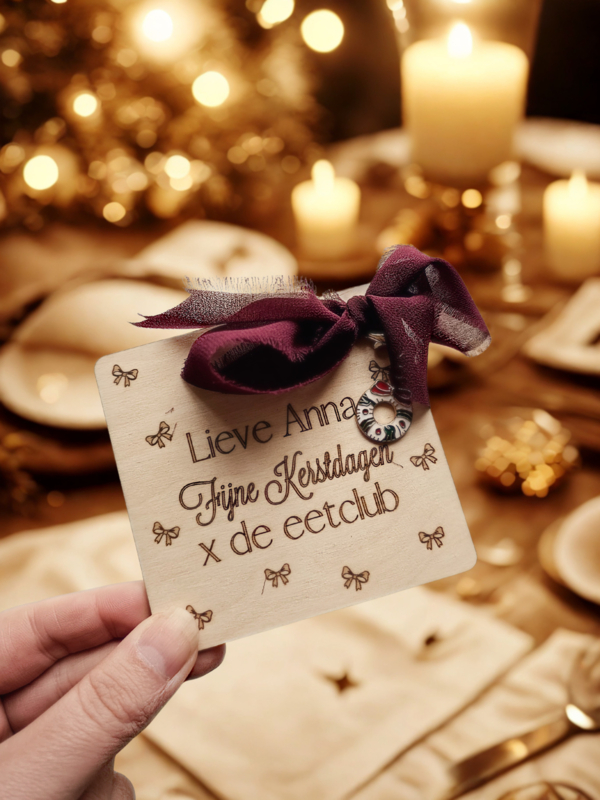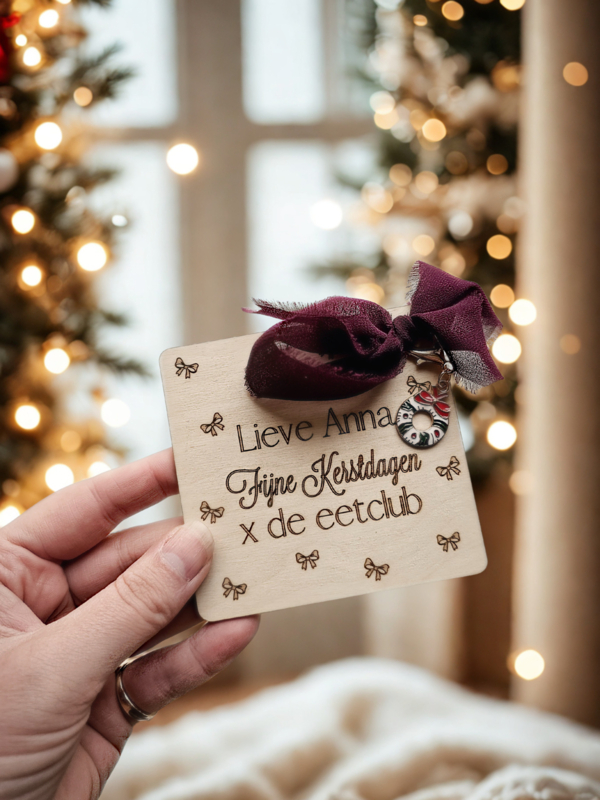 Kerst Bedankje Strikjes Bows - Eigen Tekst & kerst charmGepersonaliseerde houten kaart met eigen tekst & kerst charm– een blijvende persoonlijke boodschap